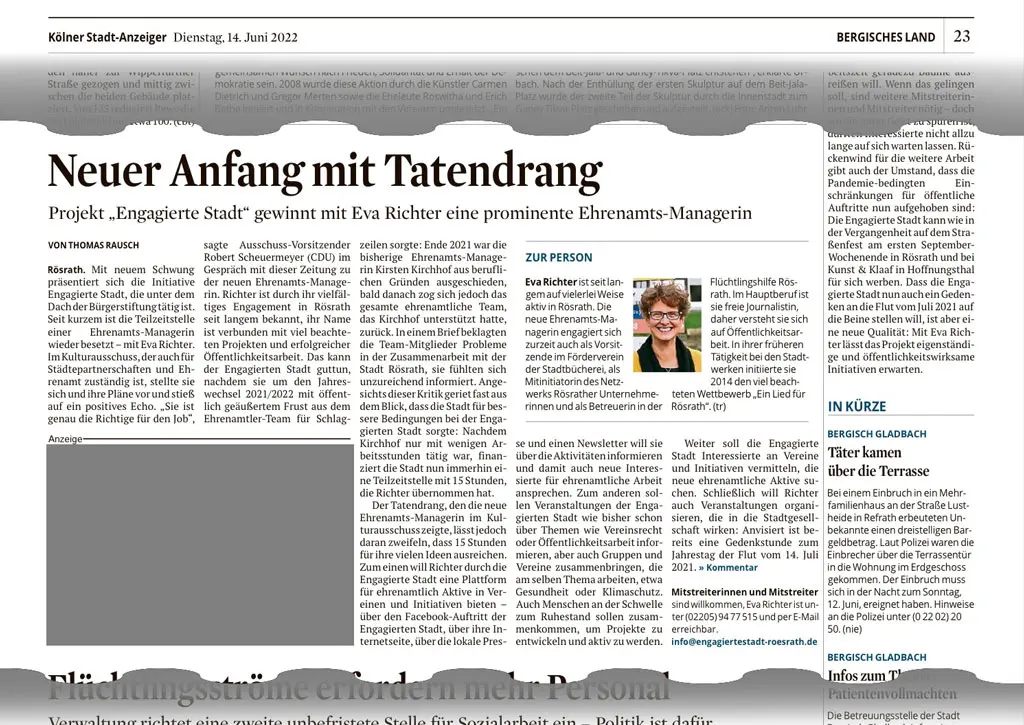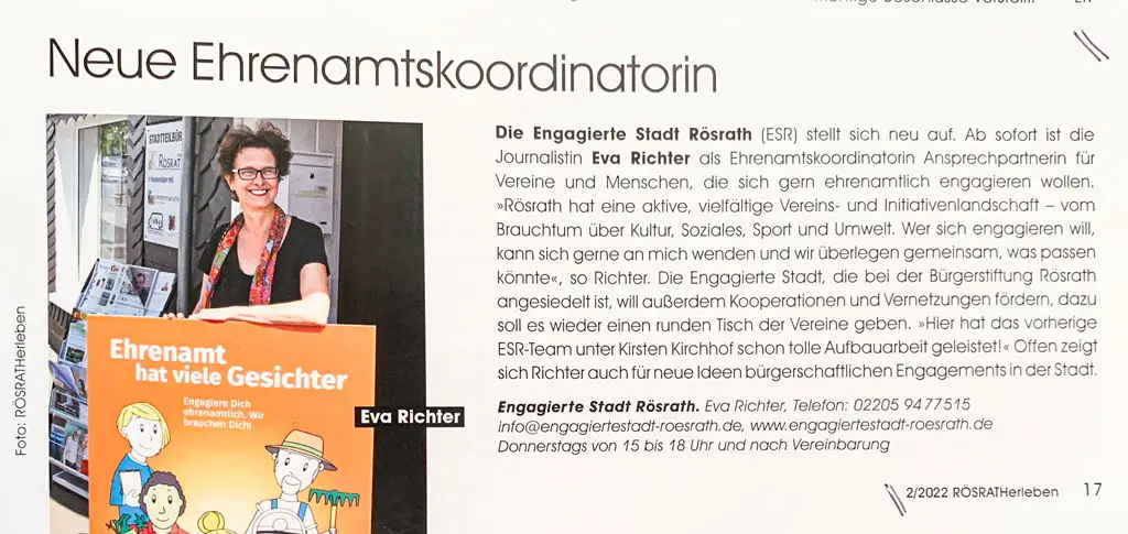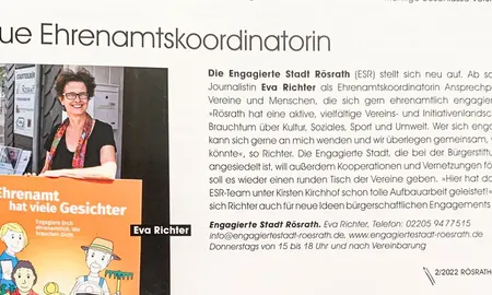 Mit Eva Richter, durch ihr vielfältiges Engagement in Rösrath seit langem bekannt, wurde eine neue Ehrenamtskoordniatorin für die "Engagierte Stadt" gefunden.